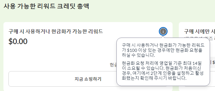 리워드가 100달러 이상 있는 경우 현금화 요청을 통해 적립금에서 현금으로 전환할 수 있도록 바뀌었네요.
