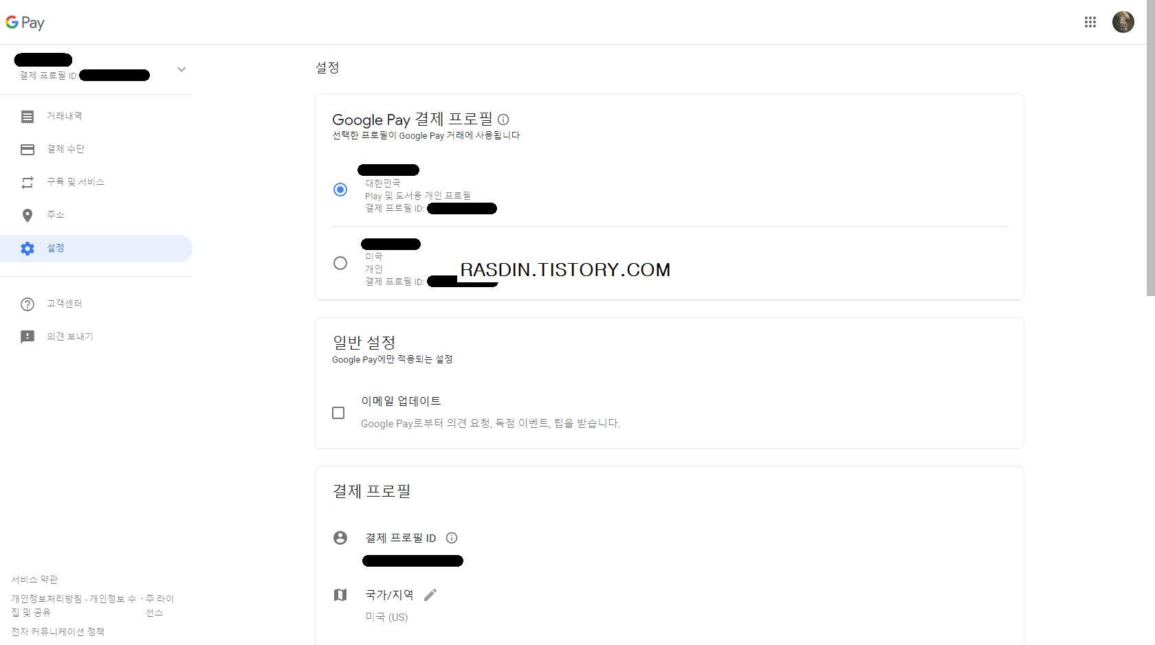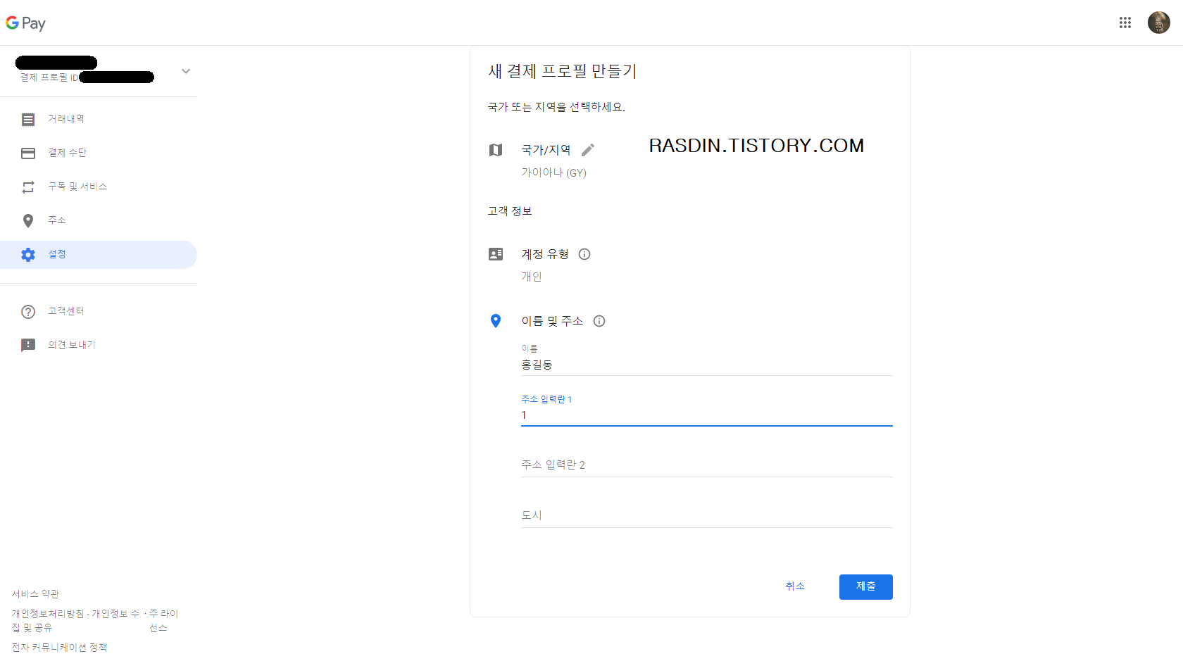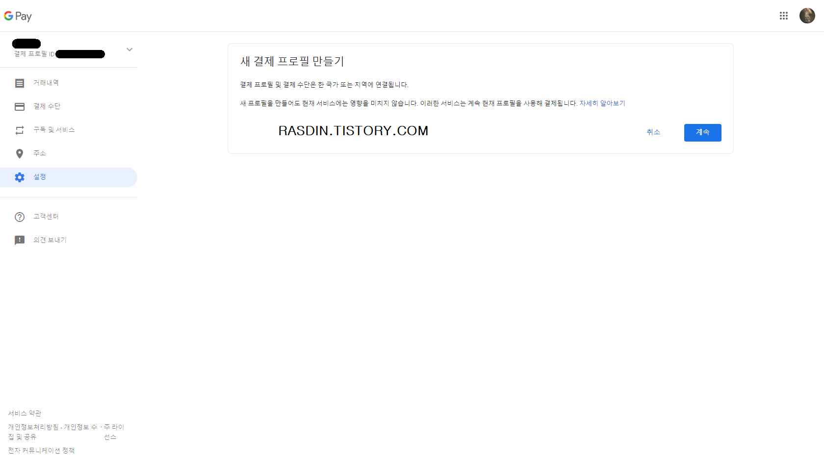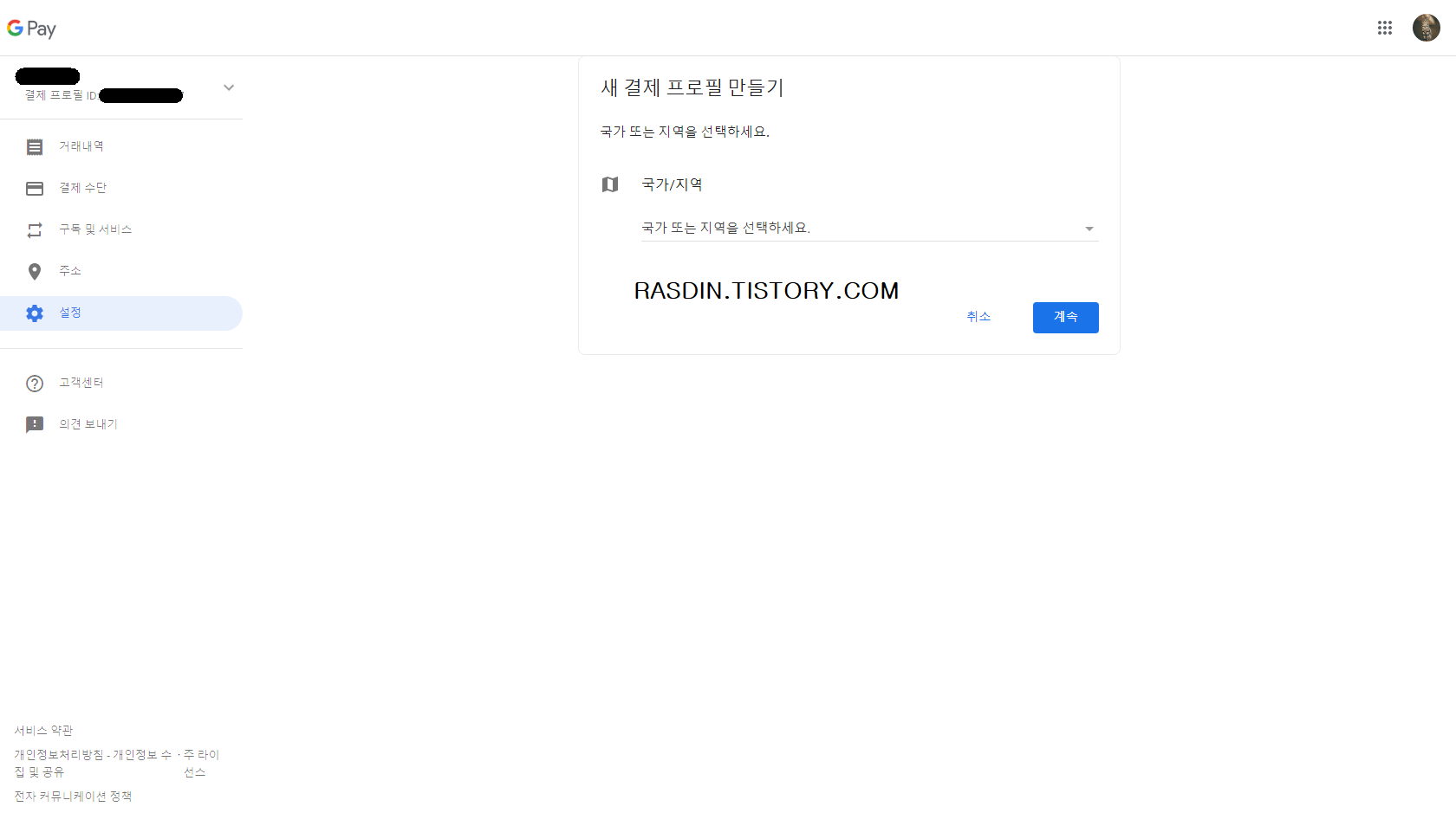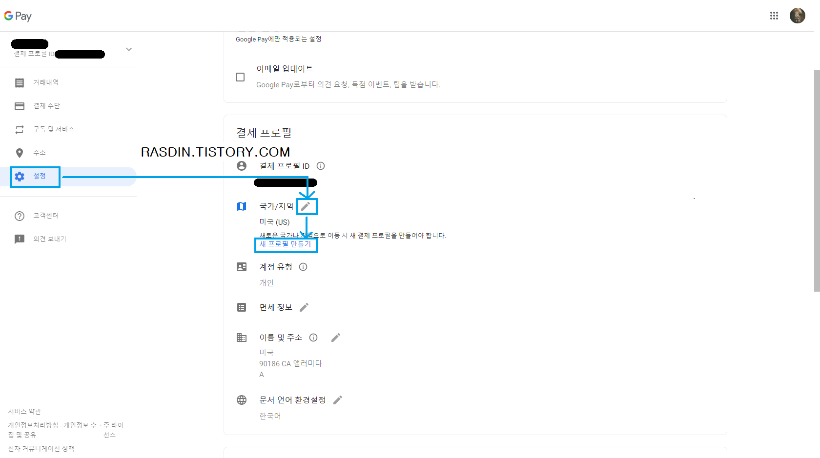 2. 구글 페이 [설정] 메뉴로 진입한 다음, 새 프로필 작성을 눌러 원하는 국가로 새 프로필을 작성해준다.