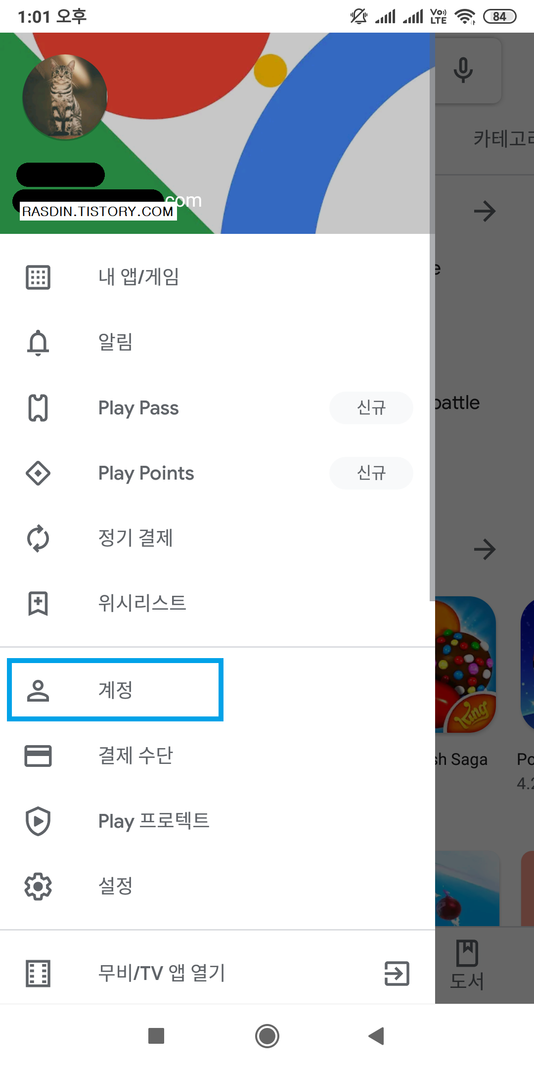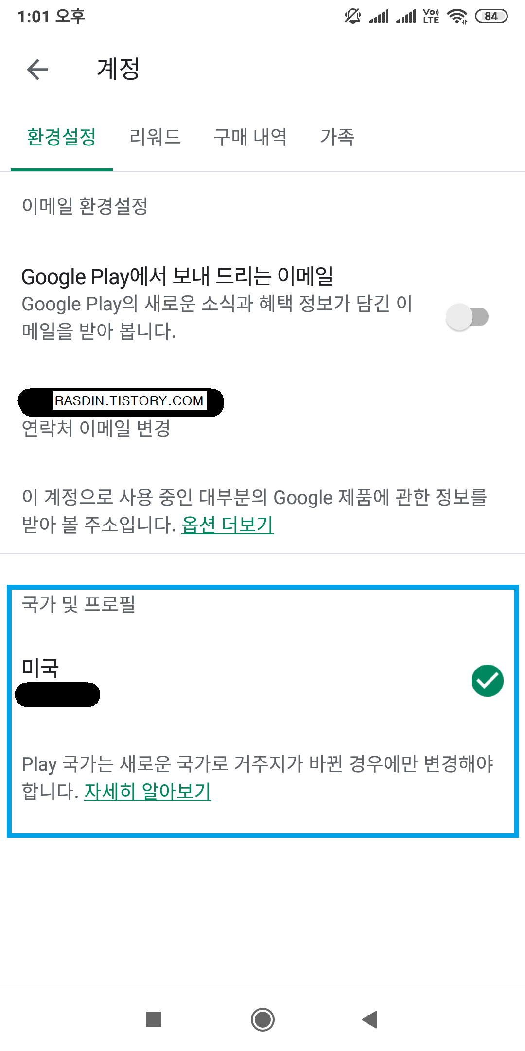 4. 구글 플레이 스토어 메뉴에서 [계정] 메뉴에서 원하는 국가로 변경한다.
