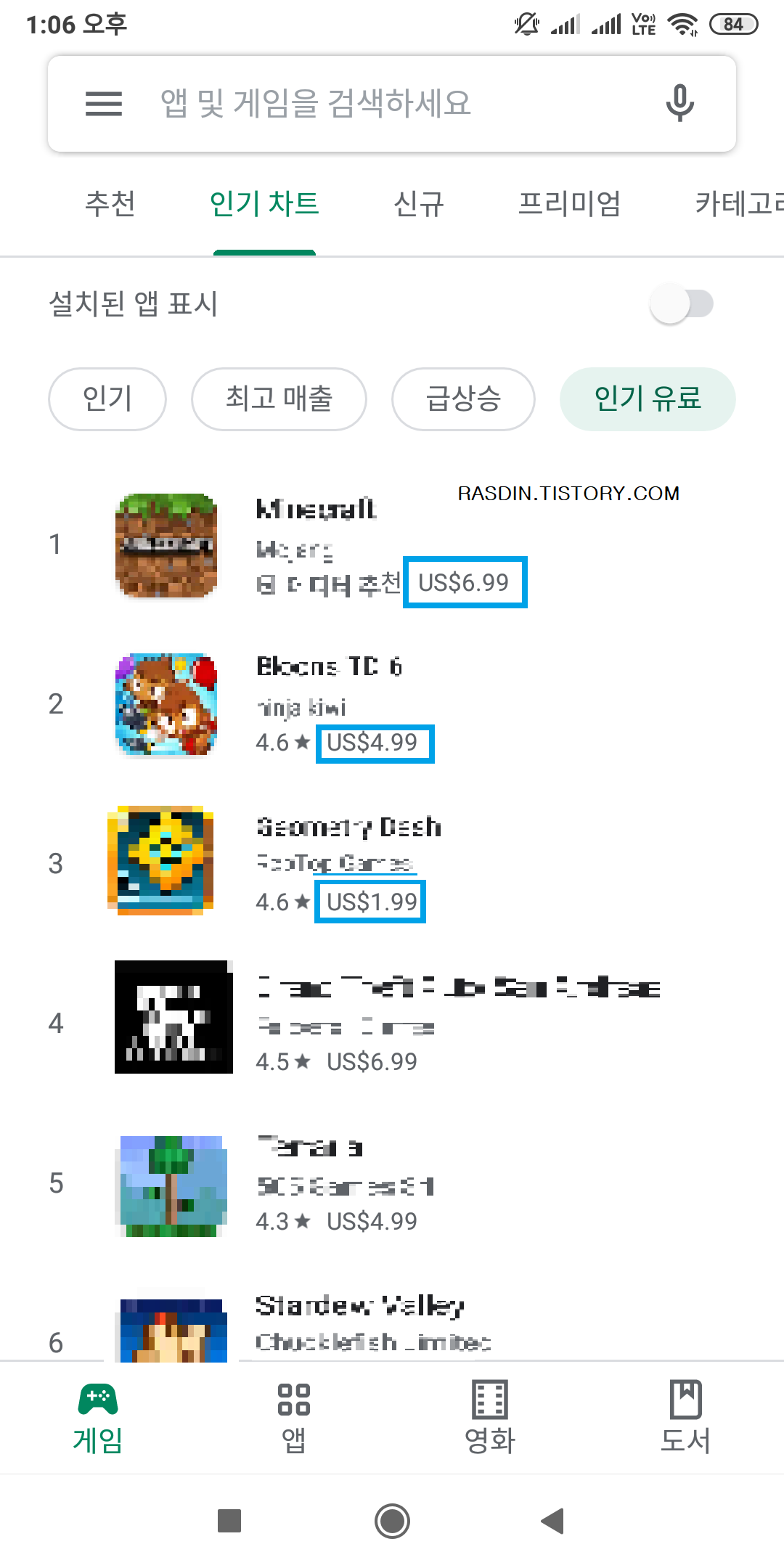 5. 몇 시간이 지난 뒤에 유료 어플들의 화폐 단위가 원하는 국가의 화폐 단위로 변경된 것이 확인되면 작업 끝.