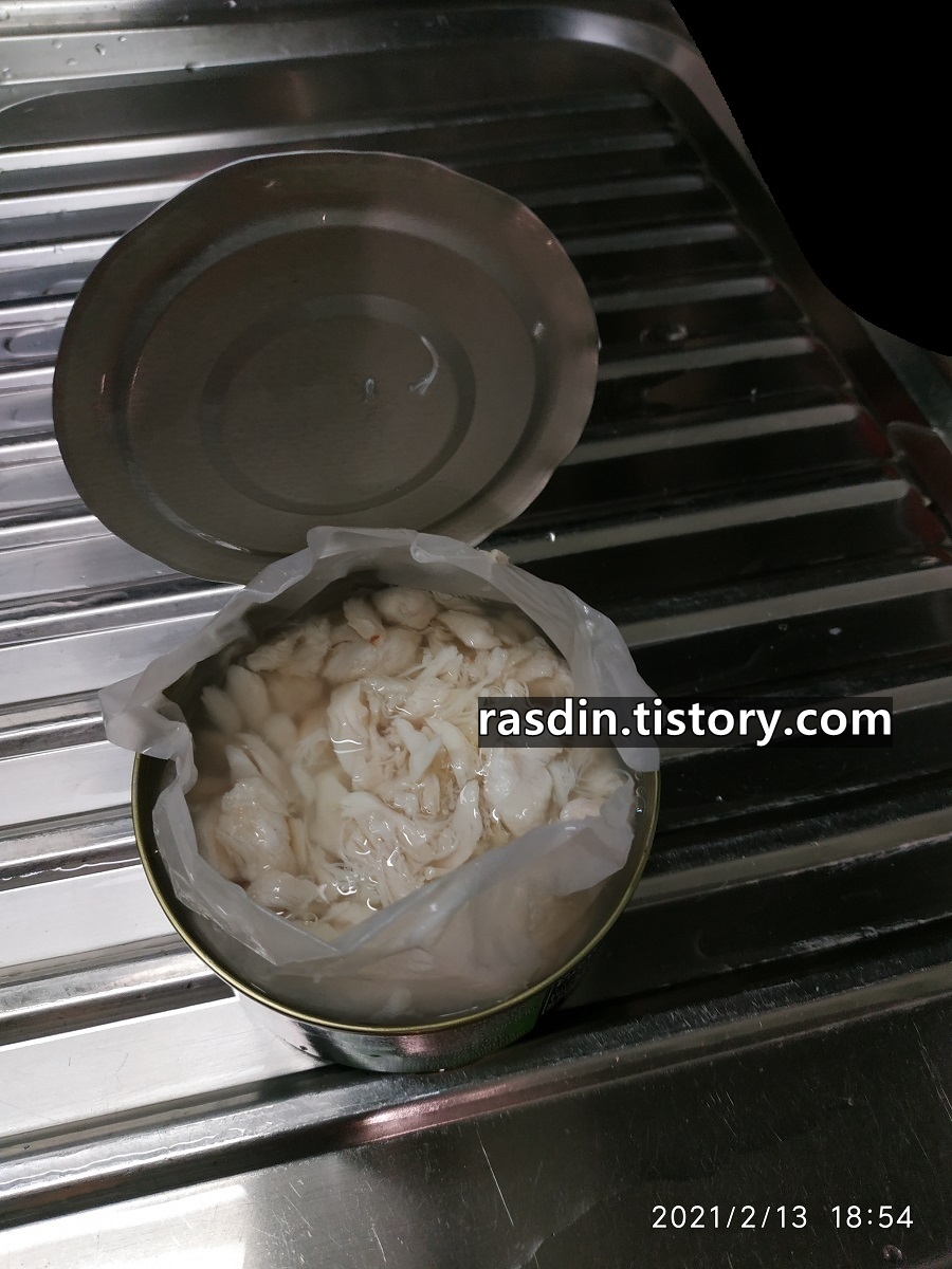 처음에는 통조림 안의 기름이 굳어버린 건가 싶을 정도로 불투명하고 고체 상태로 보이는 무언가가 게살을 뒤덮고 있었거든요.