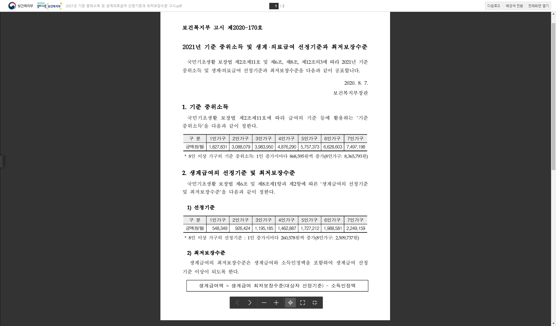 소득 기준금액은 1인 가구부터 7인 가구까지 기재되어있으며, 8인 이상 가구의 경우 가구원이 1인 증가할 때마다 868,595원씩 증가한다고 합니다.