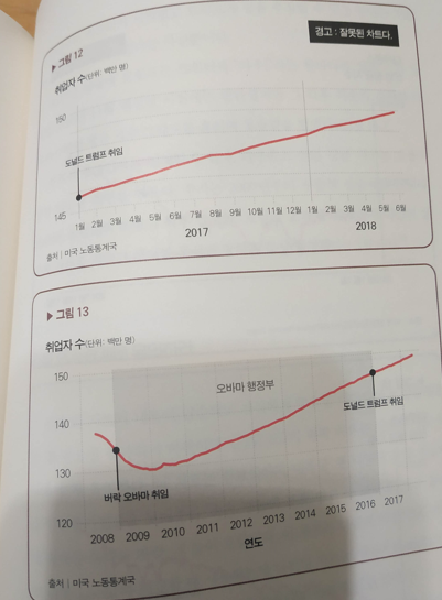 위 차트는 트럼프 정부가 마치 트럼프 취임 이후부터 취업자 수가 증가하고, 전임 대통령인 오바마때는 취업자 수가 현저히 적었던 것처럼 보이도록 편집한 차트를 발표했었지만, 사실 취업자 수는 오바마 대통령 임기때부터 초기 하락은 있었으나 꾸준히 상승하고 있었다.
