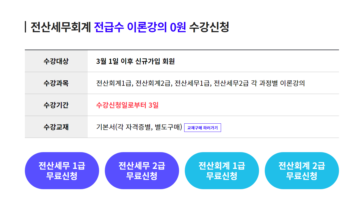 특히 전산세무 1급같은 경우 이론 강의를 제공하는 곳을 찾아보기 정말 힘든데요.. 에듀윌에서 제공하는 무료 강의를 통해 도움을 받는다면 보다 쉽게 공부할 수 있습니다.