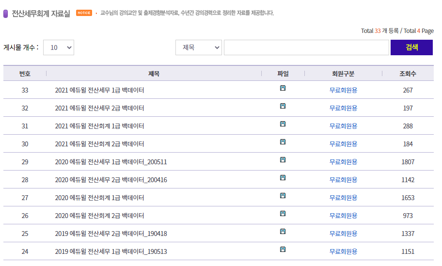 이 곳을 통해 전산세무 1급, 2급과 전산회계 1급, 2급의 백데이터를 다운로드받을 수 있습니다.